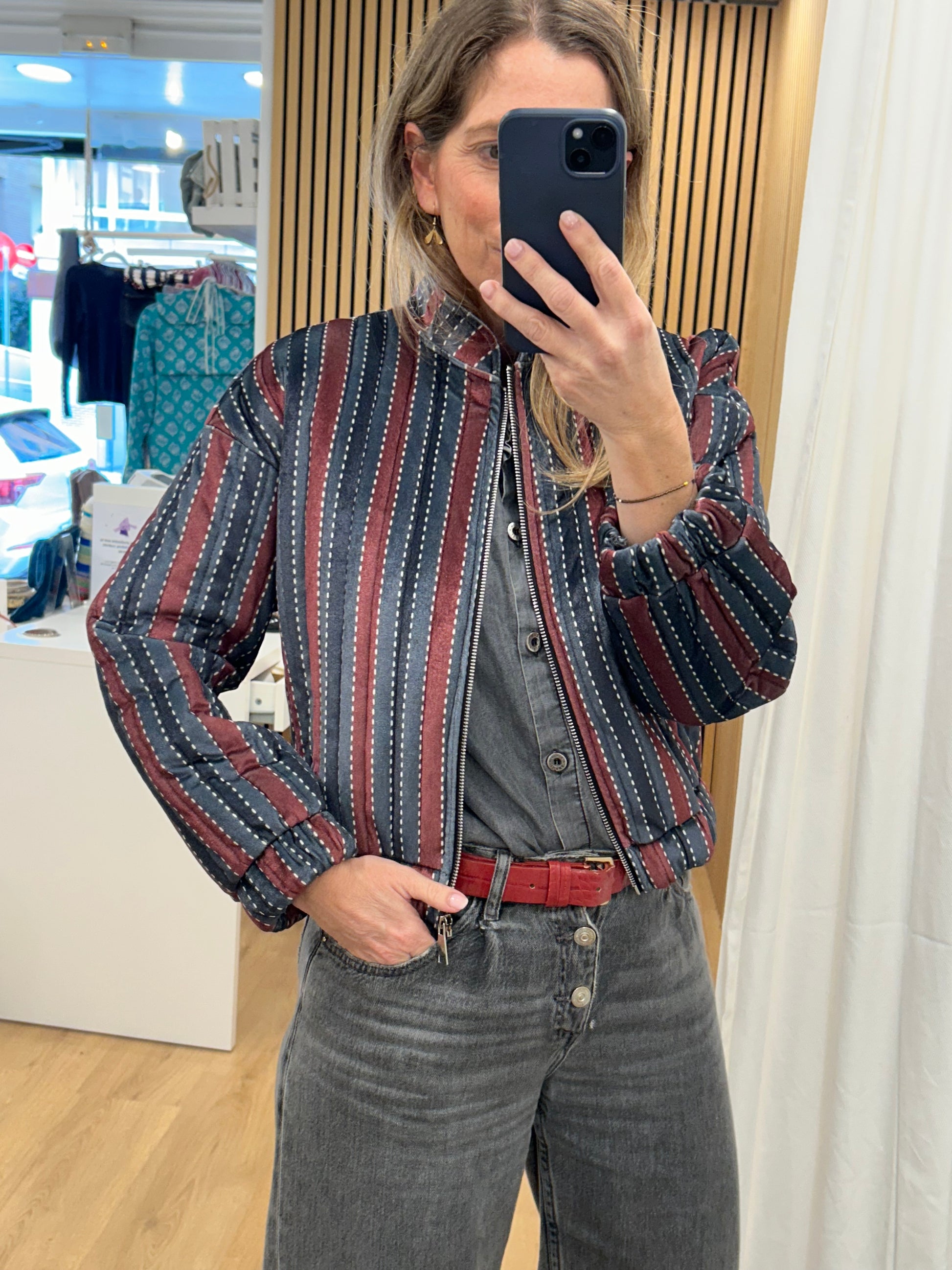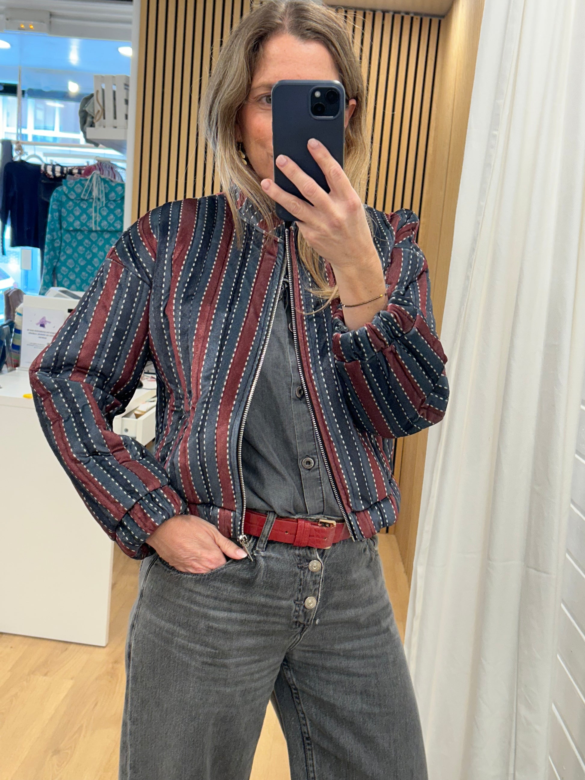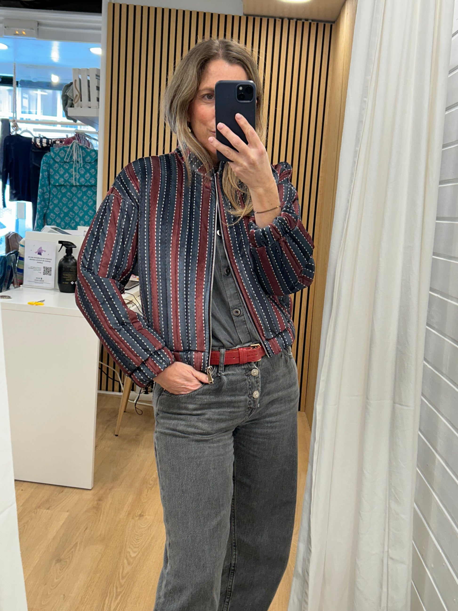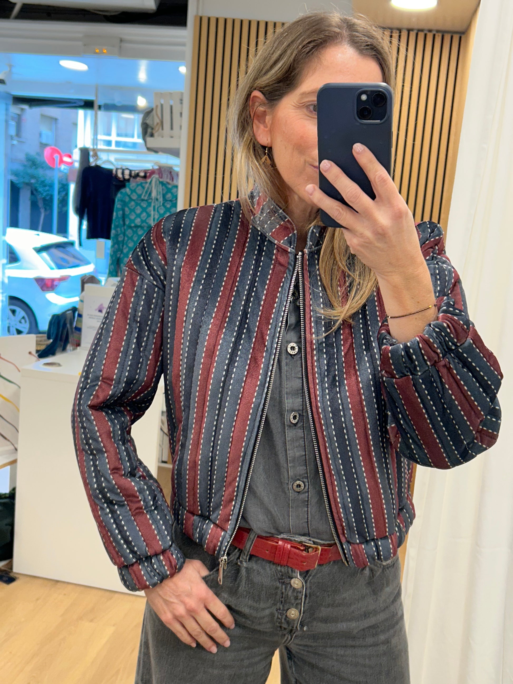 Bómber en tejido aterciopelado. Con un estampado de rayas súper original en colores grises y burdeos. Lleva Cremallera y es súper gustosa y abrigada. Talla única