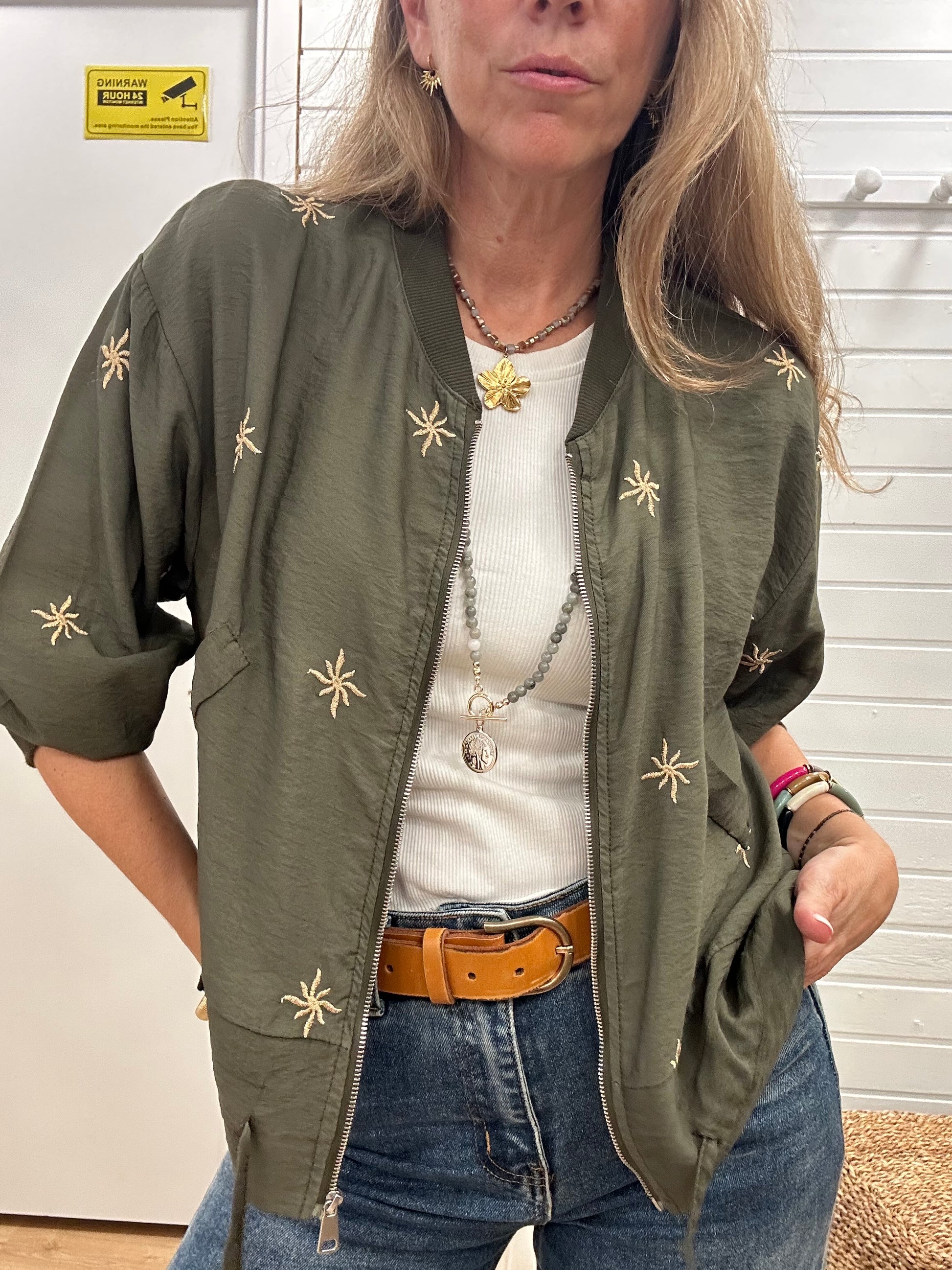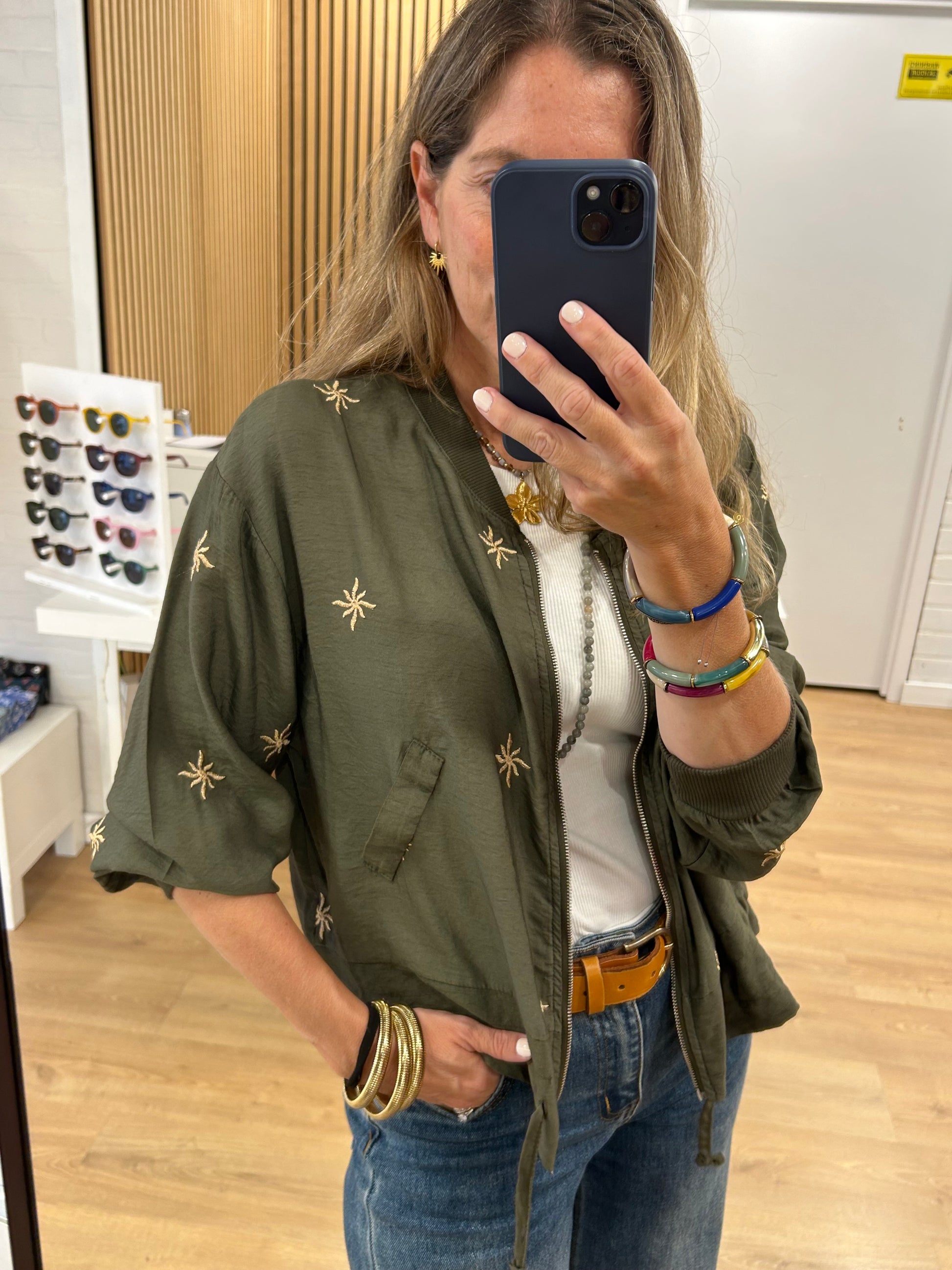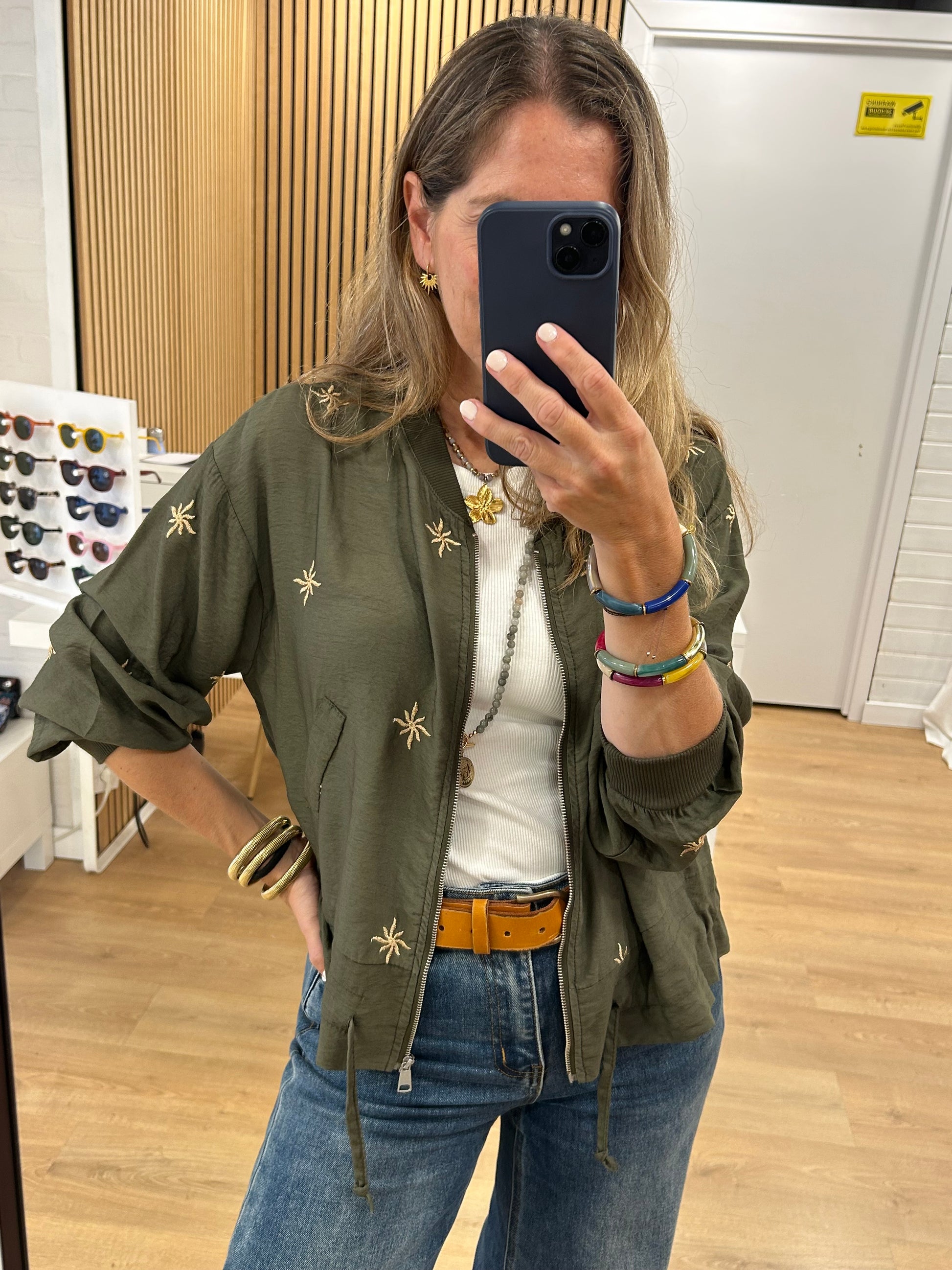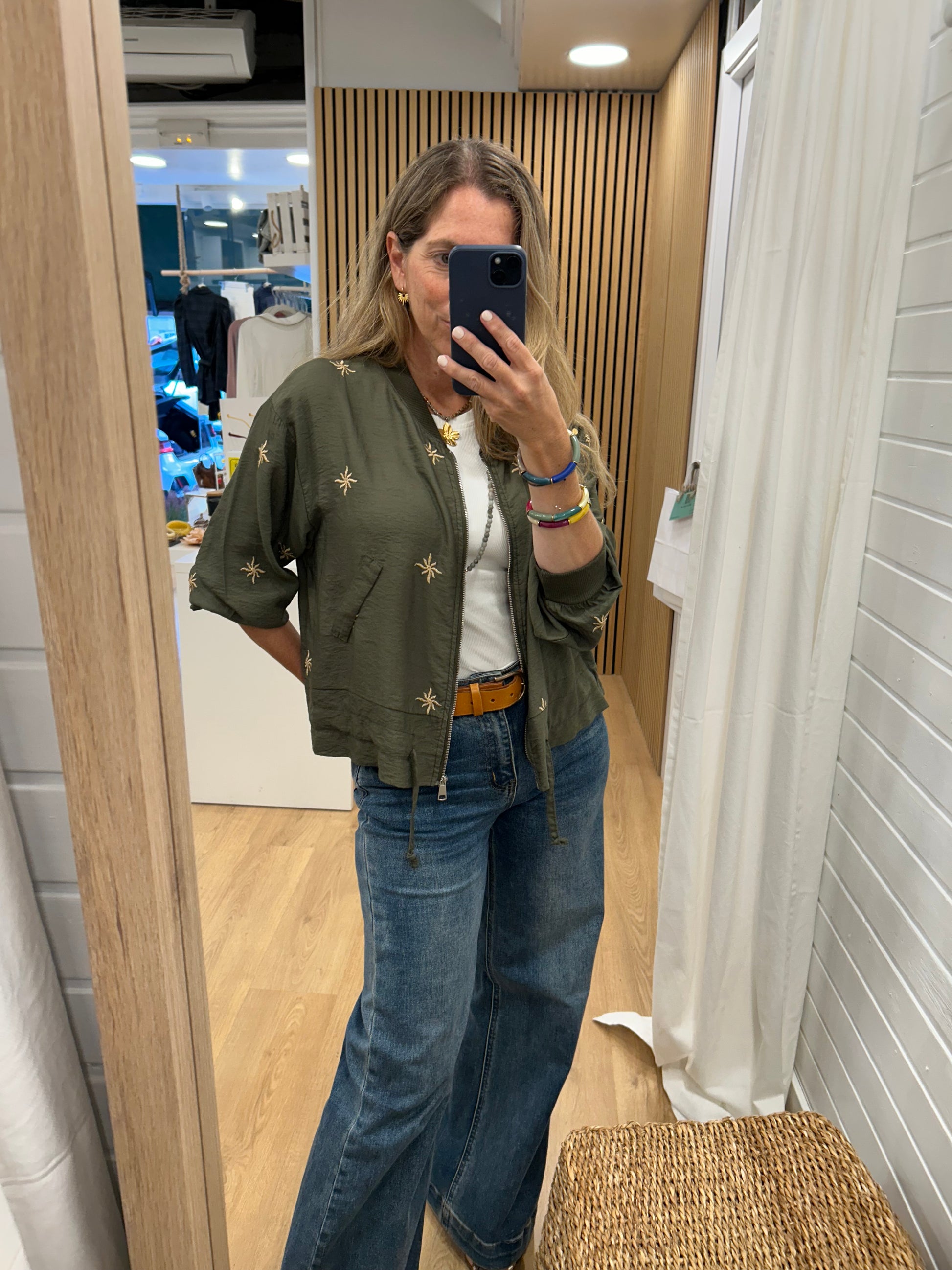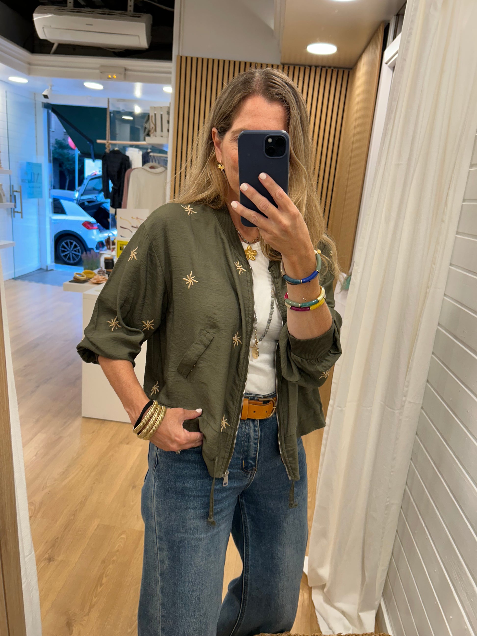 Cazadora tipo Bómber con cremallera. Lleva bordadas estrella polares es un tono dorado con el que se consigue un contraste precioso. es finita. lo que la convierte en una cazadora ideal de entretiempo y para llevar debajo de un abrigo más grueso. talla única.