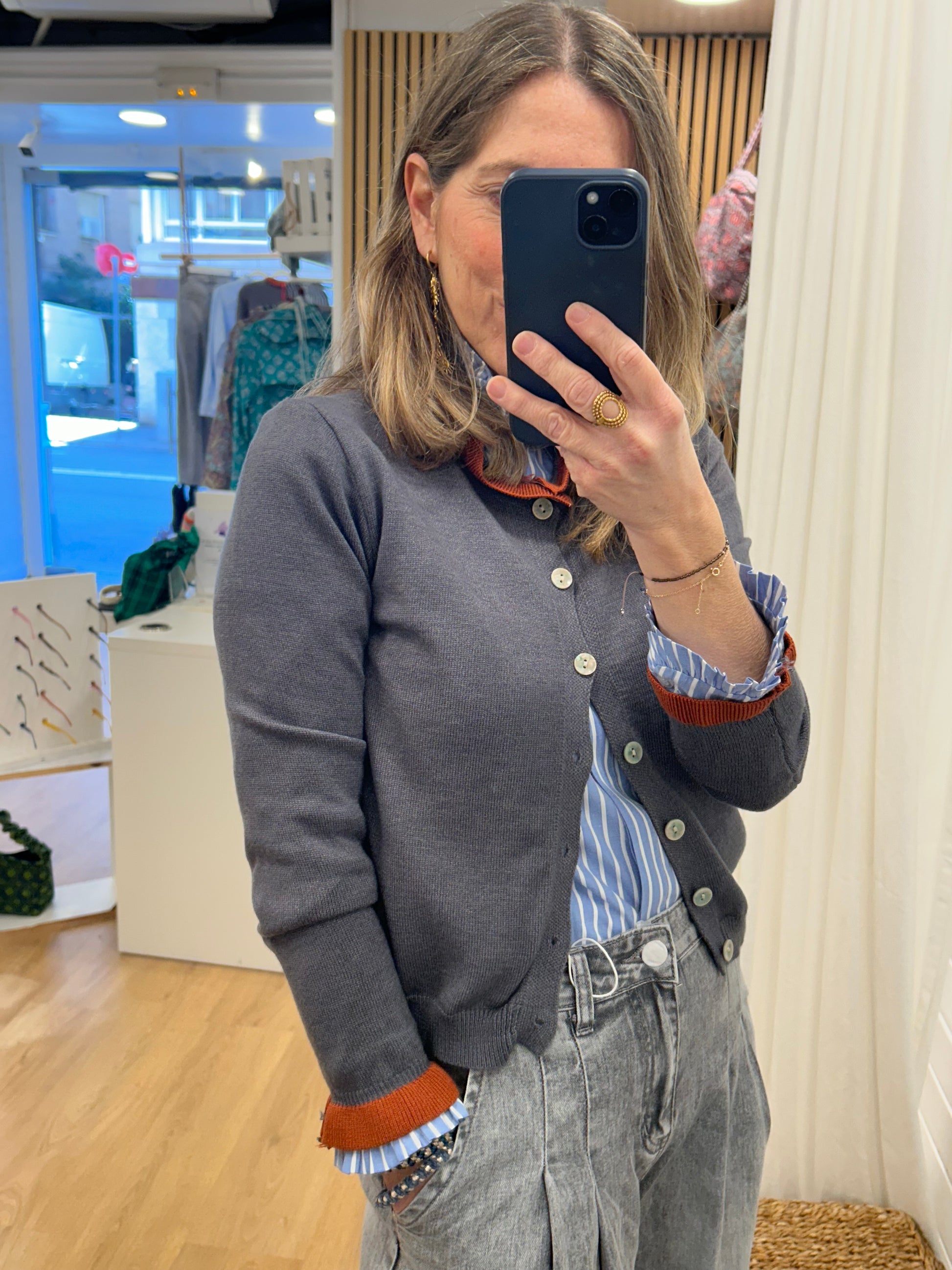 Cárdigan ideal en color gris contrastado con caldero. Tiene un tacto súper suave y lleva un volantito en color caldero en el cuello y en los puños, súper original y favorecedor. Talla única.