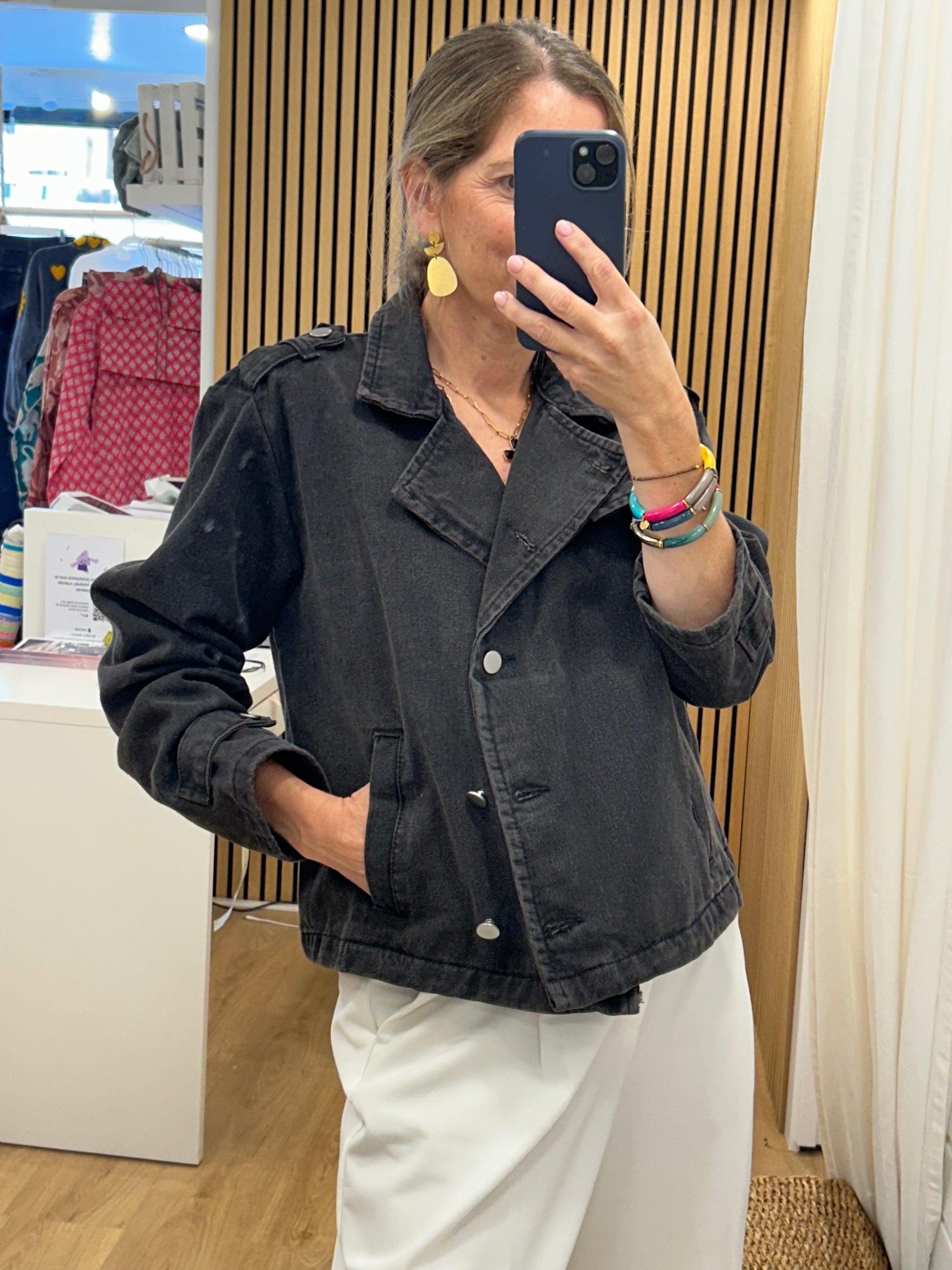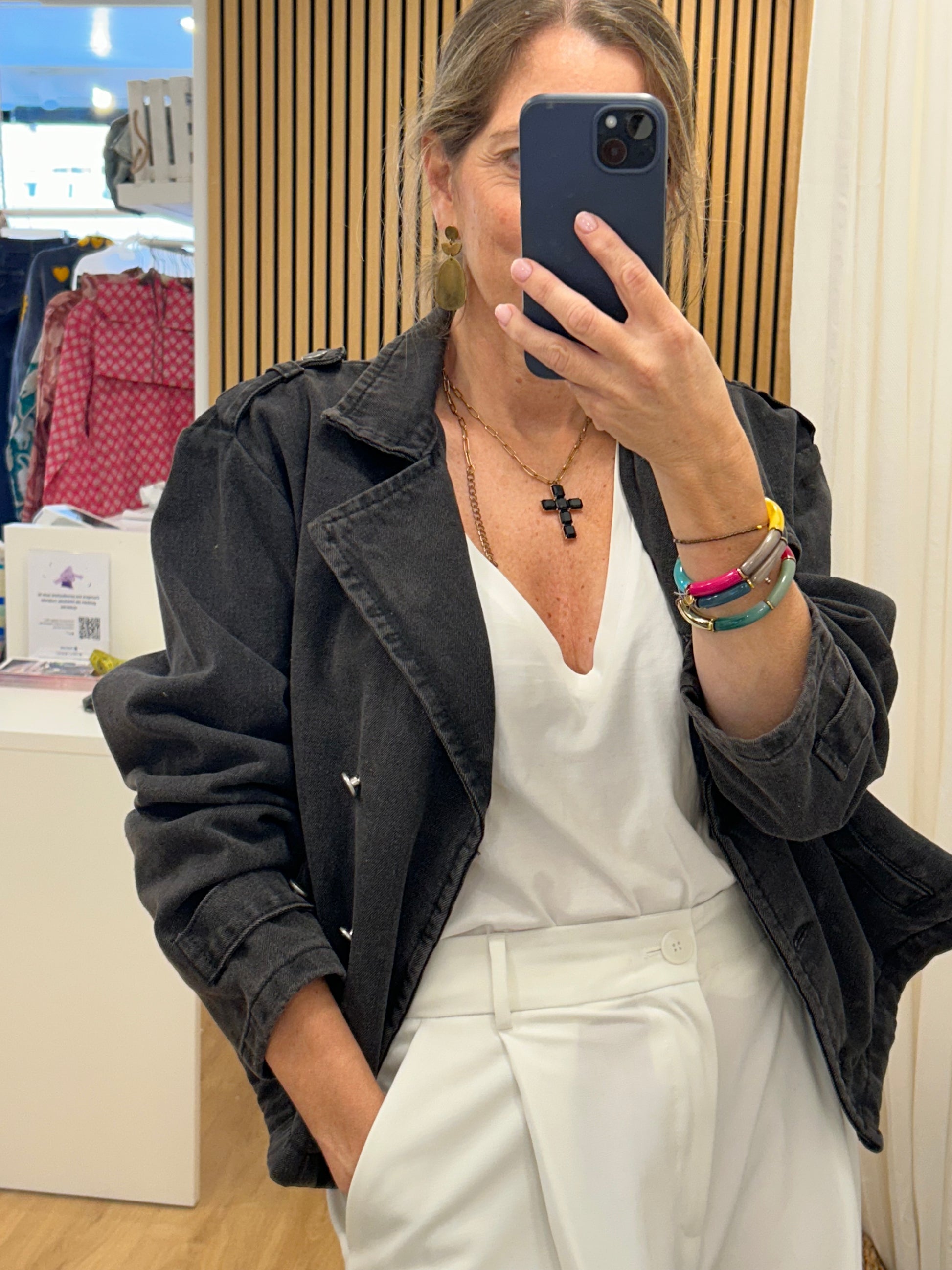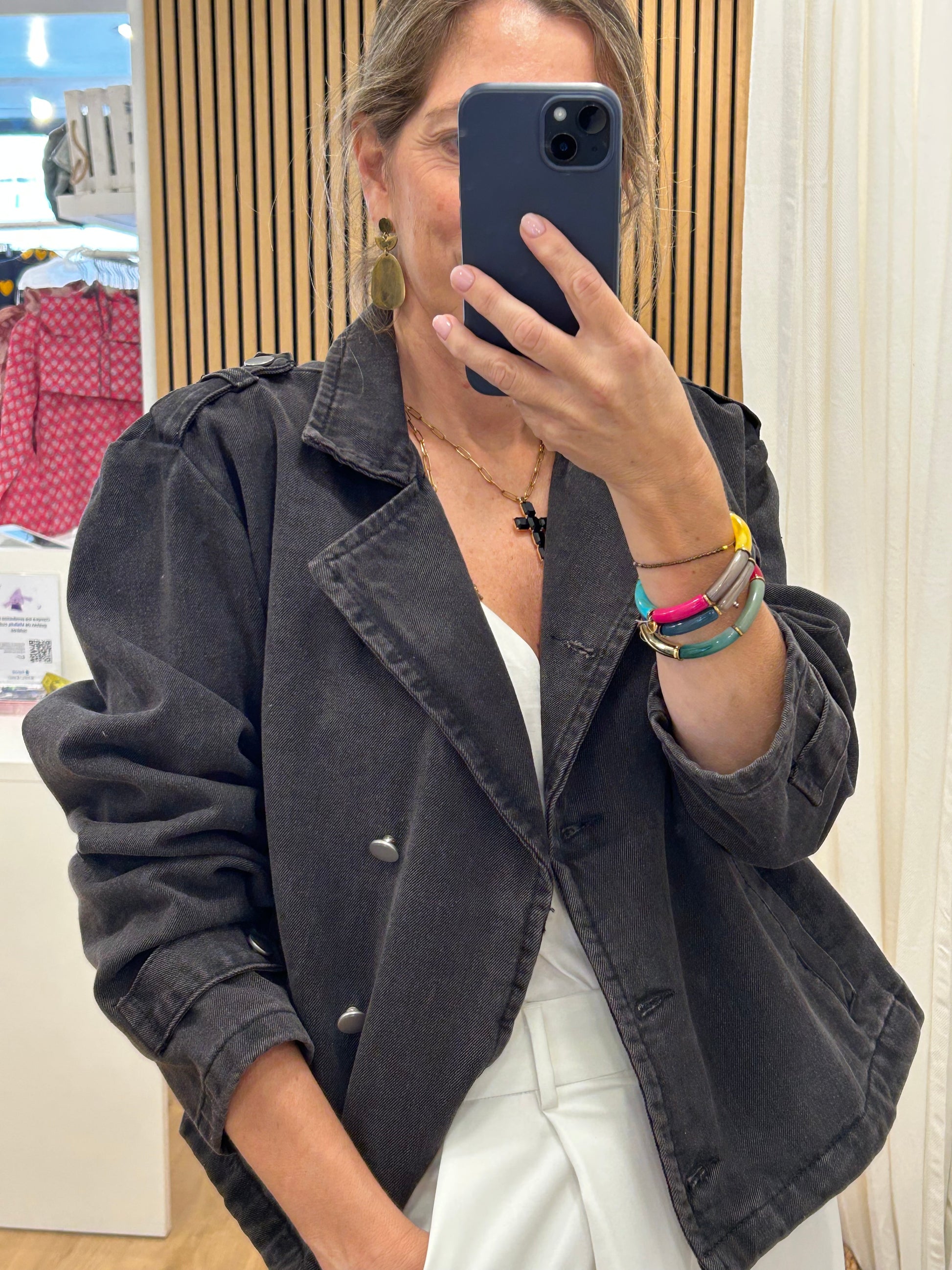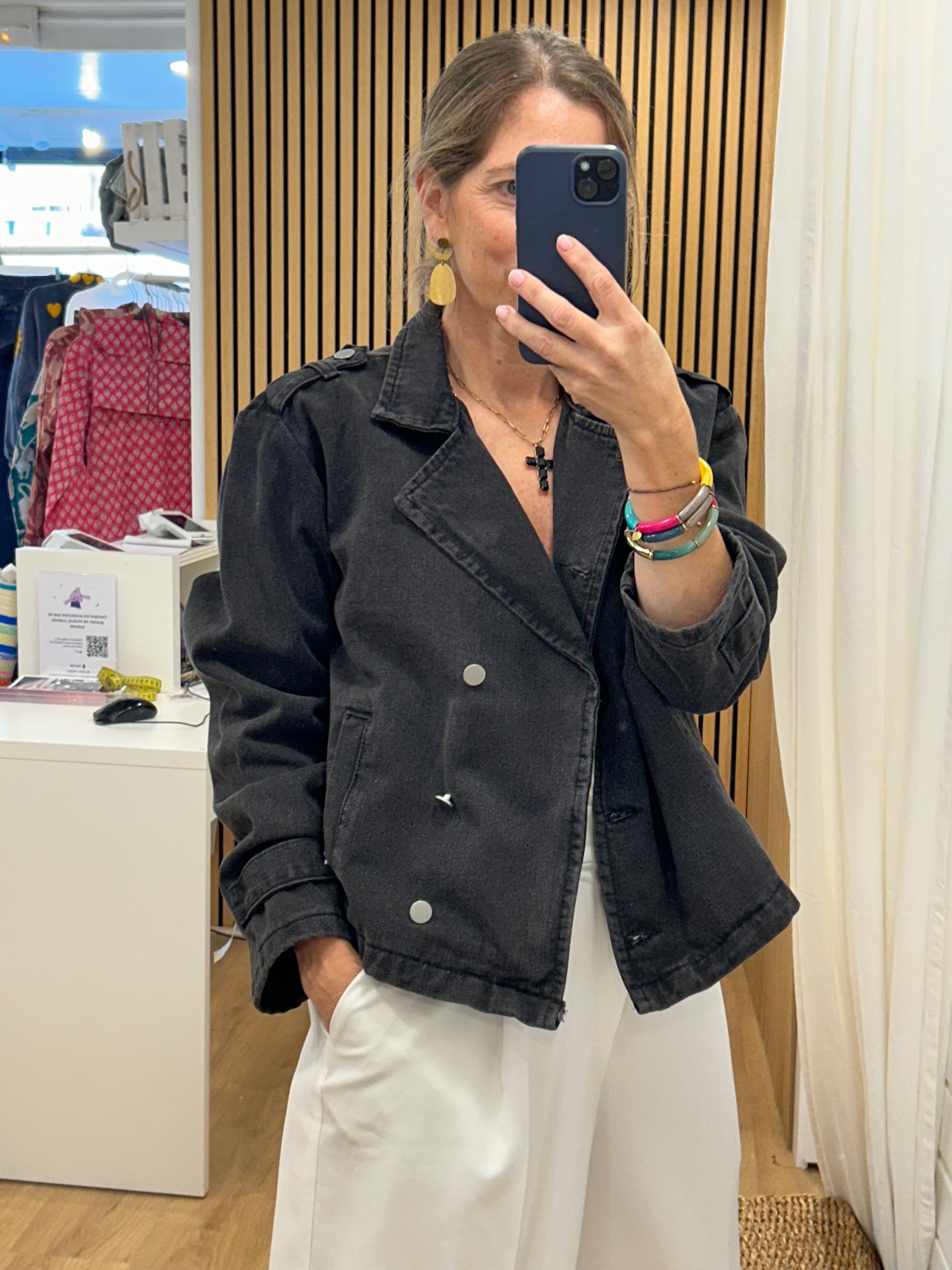 Cazadora en tejido denim gris oscuro. El patrón es como el de una gabardina cortita, súper en tendencia, y el tejido dénim le da un rollo espectacular.