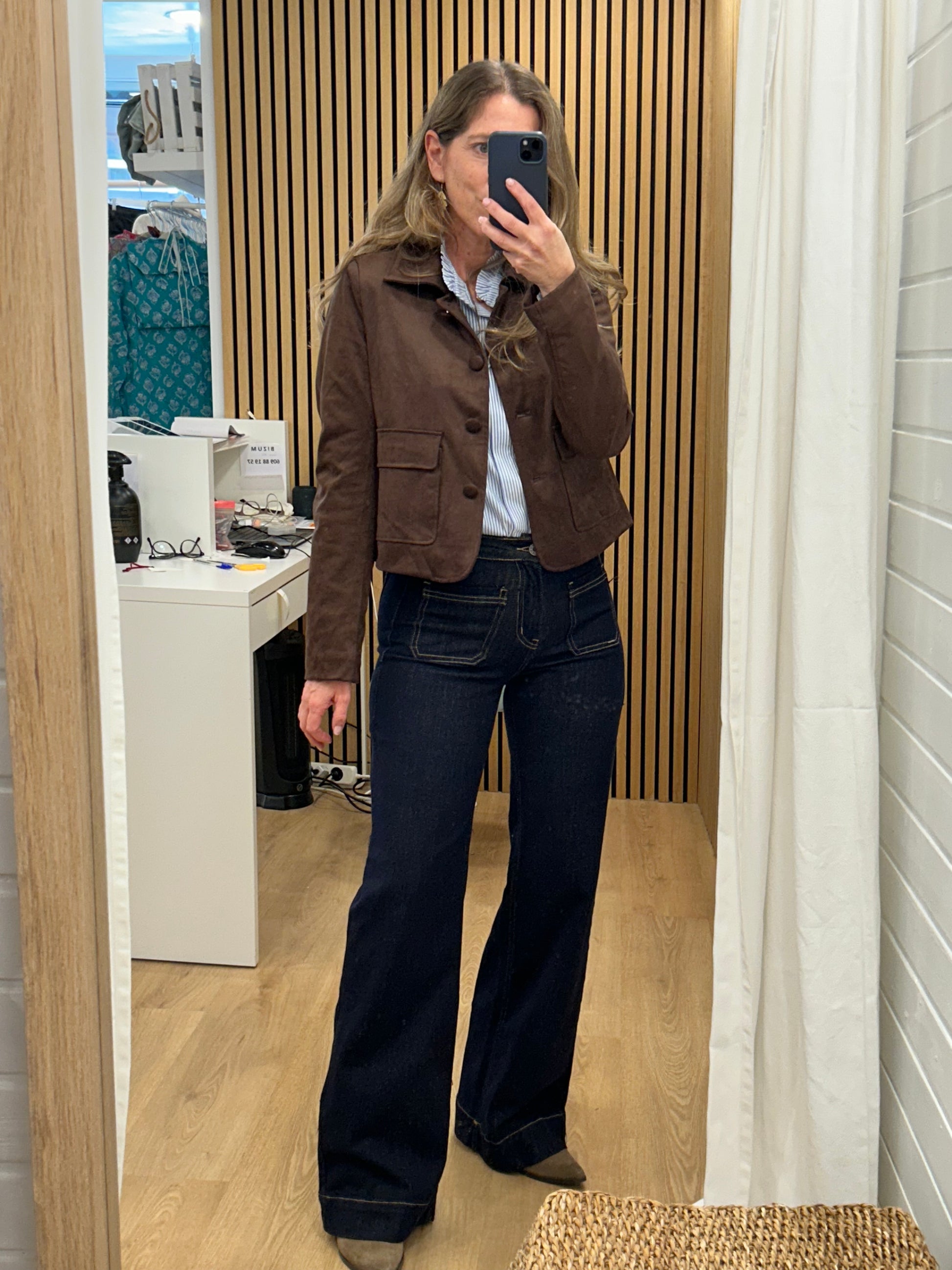 Chaqueta de Antelina. Esta chaqueta es un acierto seguro para elevar tu outfit. es cortita, súper tendencia, en el color de la temporada y en tejido de antelina que es un must.