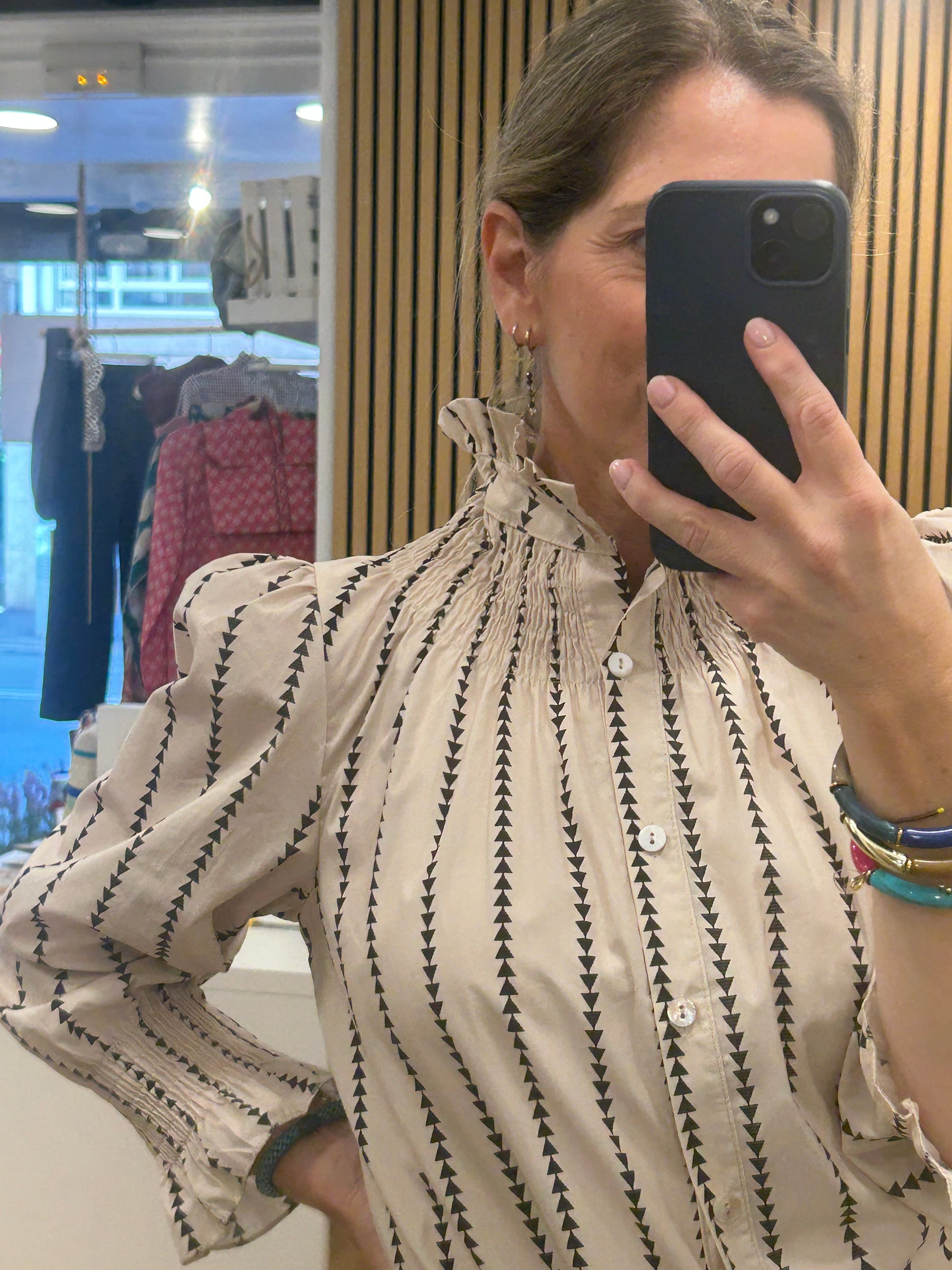Camisa con estampado geométrico que forma líneas verticales. Tiene el cuello subido, haciendo un volante y las mangas de farol, abullonadas en el hombro. Talla única.
