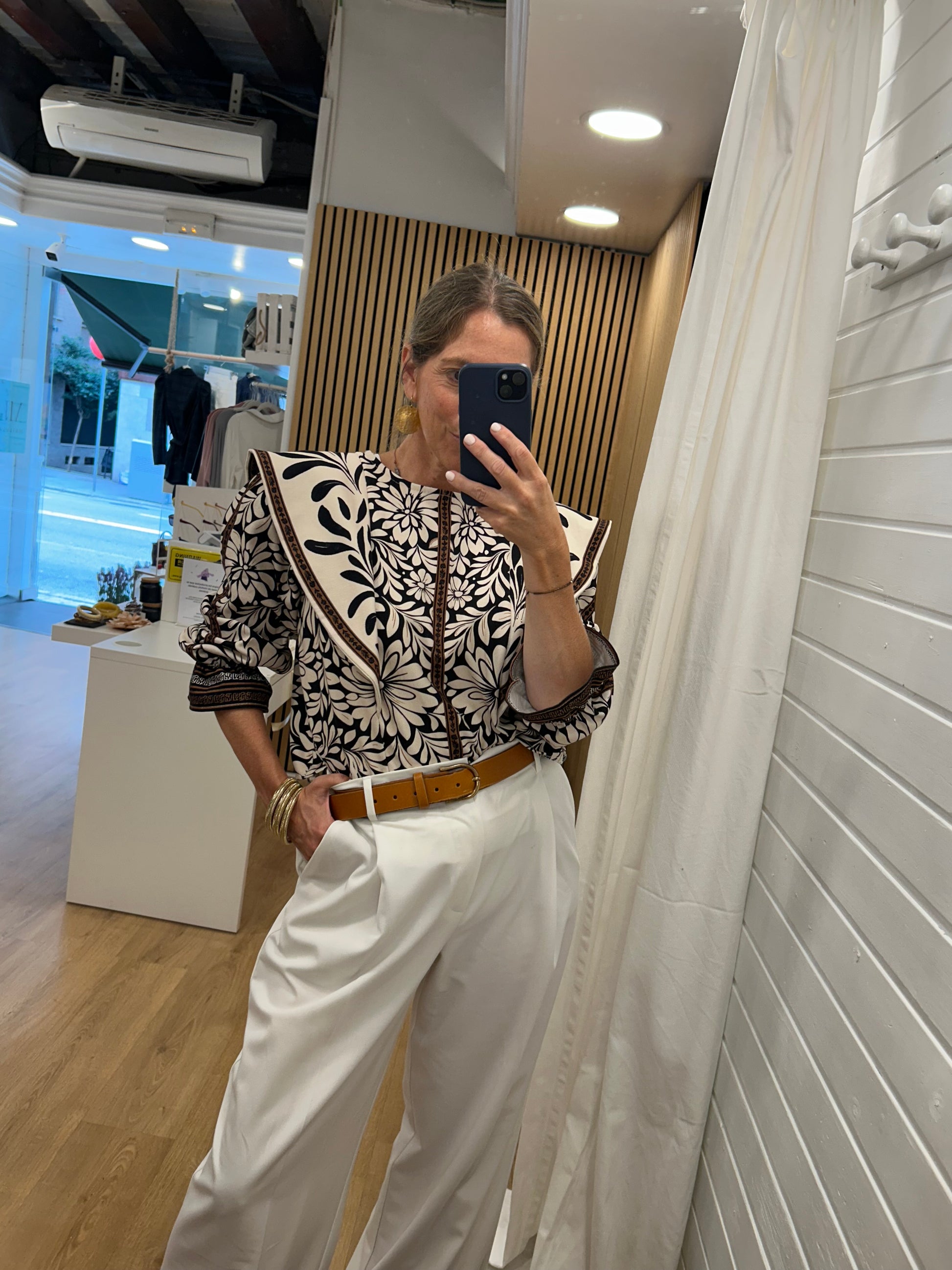 Top estampado de manga larga, muy original por el volante que se convierte en alerón en el hombro y le da un estilazo impresionante. El top combina varios estampados en la misma gama y estilo. Manga larga con goma en el puño, lo que permite remangarla con facilidad. Talla única